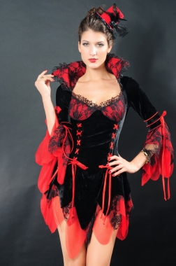 Vestido seductor de vampiro terciopelo elástico negro con cuello alto, forro rojo, detalle con cordones, dobladillo rallado y mangas tres cuartos.